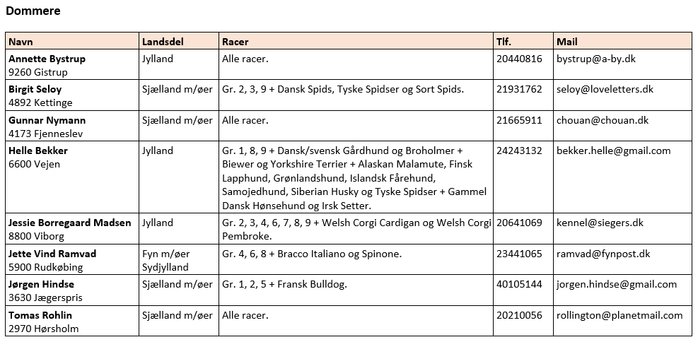 DKK har således truffet aftale med nedenstående dommere om, at hundeejere gerne må kontakte dem direkte for at træffe aftale om at få foretaget en eksteriørbedømmelse privat hos dommeren.