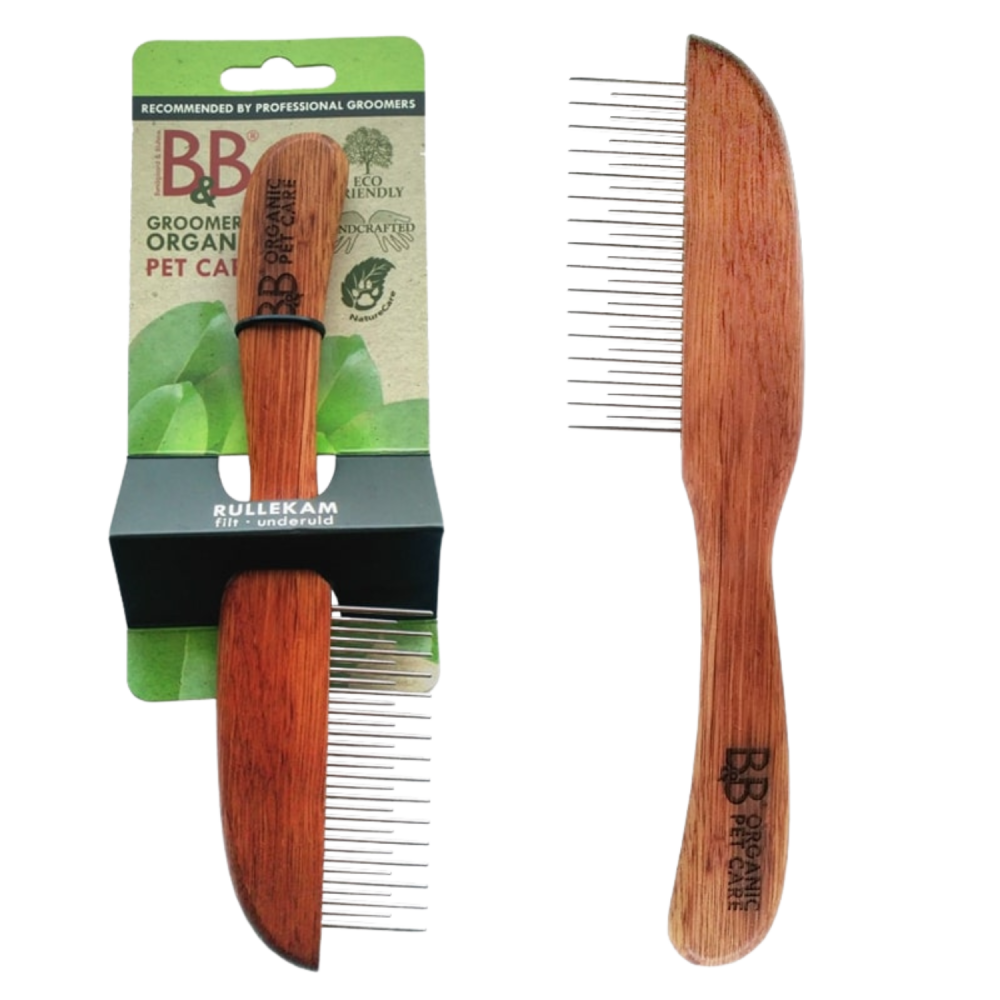 B&B Rullekam er designet til nænsomt at løsne filt og underuld uden at skade pels eller hud. De rullende tænder med afrundede ender glider let gennem pelsen og gør udfrisering både effektiv og behagelig for din hund.