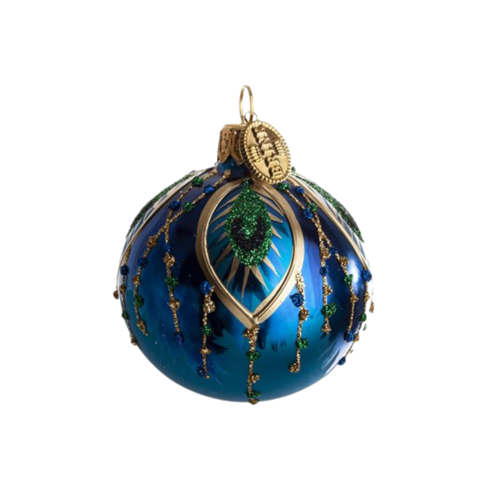 Vores julekugle i smukke påfugle farver fås i 8 cm og 6 cm som den på billedet. Flot på juletræet eller i vinduet.