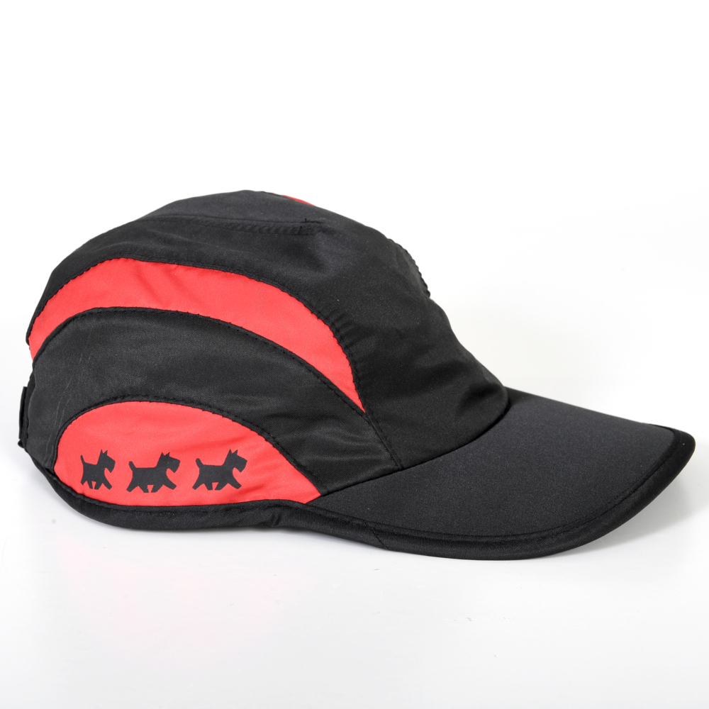 Sort kasket med røde striber og 3 sorteDKK hunde printet på hver side.