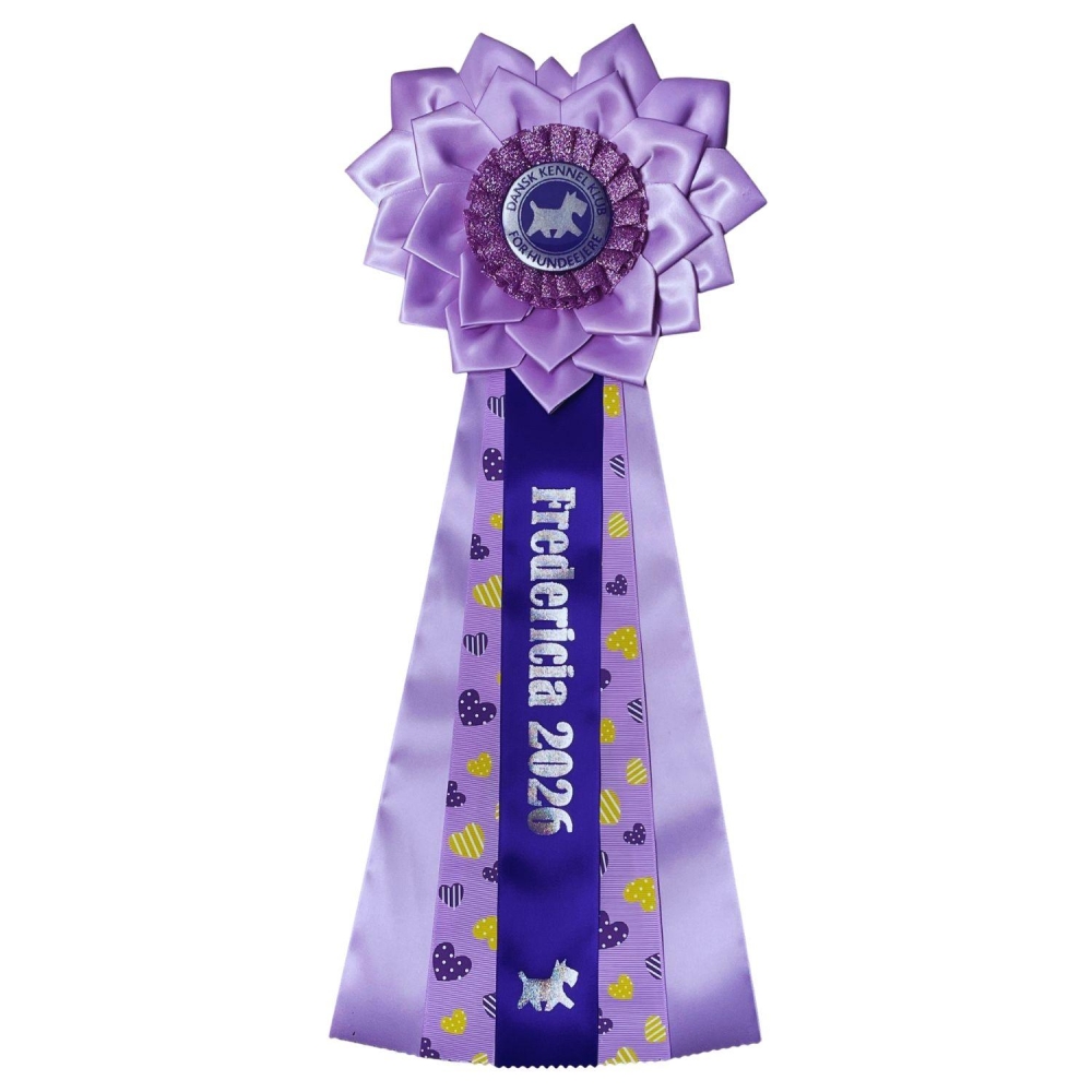 Rosetten er dekoreret med DKK’s logo og dekorative bånd med hjerter – en fin hyldest til både hunden og udstillingsoplevelsen, med lidt valentine´s day magi.